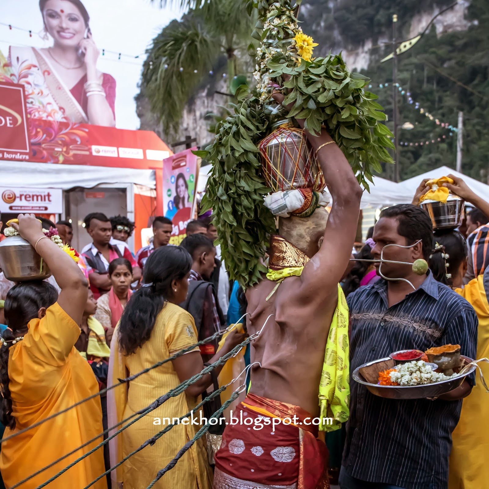There are devotees that go to the extreme as to torture their bodies to appease the Lord. Therefore, the major attraction of Thaipusam is body piercing with hooks, skewers and small spears called 'vel'. Some will pull chariots with hooks stuck to their back and spear piercing through their tongue and cheek which prevent him from speaking and gives him great power of endurance.